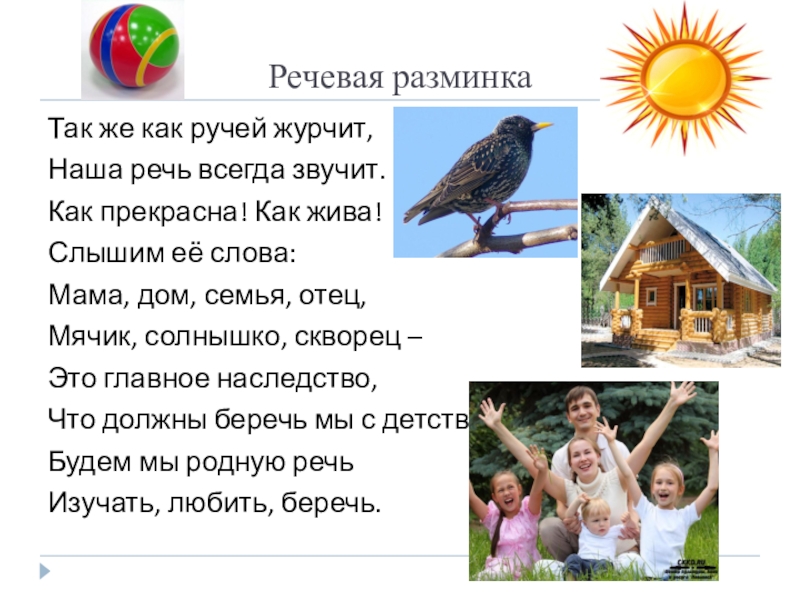 Речевая разминкаТак же как ручей журчит,Наша речь всегда звучит.Как прекрасна! Как жива!Слышим её слова:Мама, дом, семья, отец,Мячик, солнышко, скворец –Это главное наследство,Что должны беречь мы с детства.Будем мы родную речьИзучать, любить, беречь.