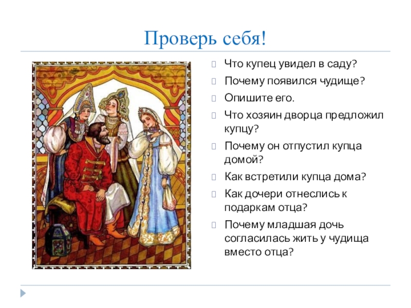 Проверь себя!Что купец увидел в саду?Почему появился чудище?Опишите его.Что хозяин дворца предложил купцу?Почему он отпустил купца домой?Как