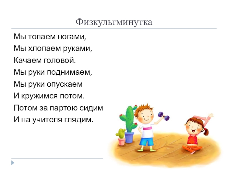 Физкультминутка Мы топаем ногами,Мы хлопаем руками,Качаем головой.Мы руки поднимаем,Мы руки опускаемИ кружимся потом.Потом за партою сидимИ на