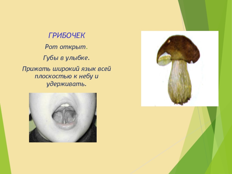 ГРИБОЧЕКРот открыт. Губы в улыбке. Прижать широкий язык всей плоскостью к небу и удерживать.