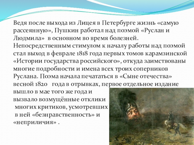 Ведя после выхода из Лицея в Петербурге жизнь «самую рассеянную», Пушкин работал над поэмой «Руслан и Людмила»