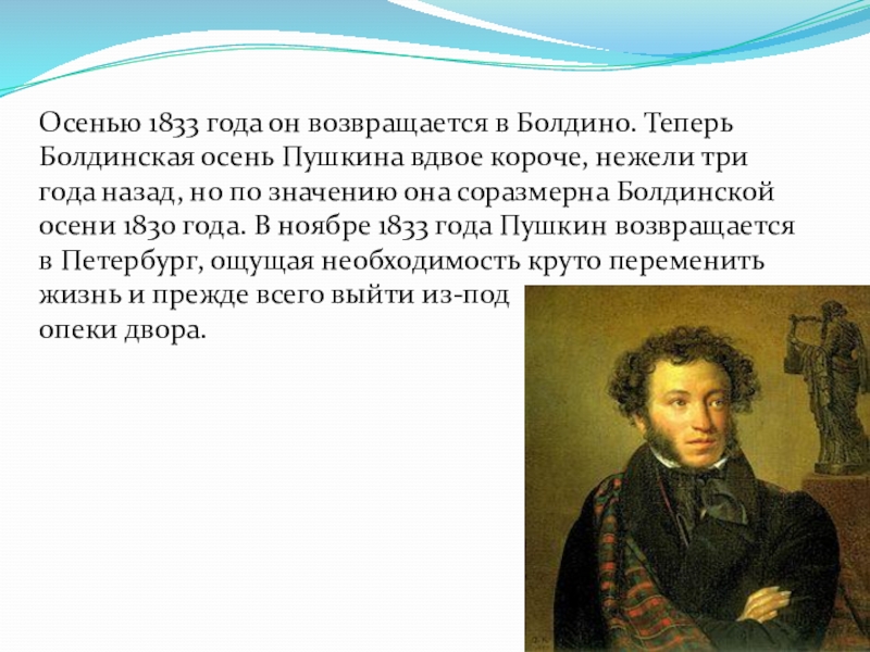нежели три года назад, но по значению она соразмерна Болдинской осени 1830 года. В ноябре 1833 года Пушкин возвращается в Петербург, ощущая необходимость круто переменить жизнь и прежде всего выйти из-под