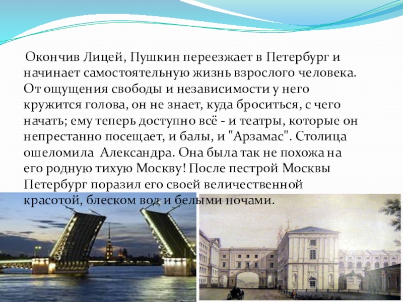 жизнь взрослого человека. От ощущения свободы и независимости у него кружится голова, он не знает, куда броситься, с чего начать; ему теперь доступно всё - и театры, которые он непрестанно посещает, и балы, и "Арзамас". Столица ошеломила Александра. Она была так не похожа на его родную тихую Москву! После пестрой Москвы Петербург поразил его своей величественной красотой, блеском вод и белыми ночами.