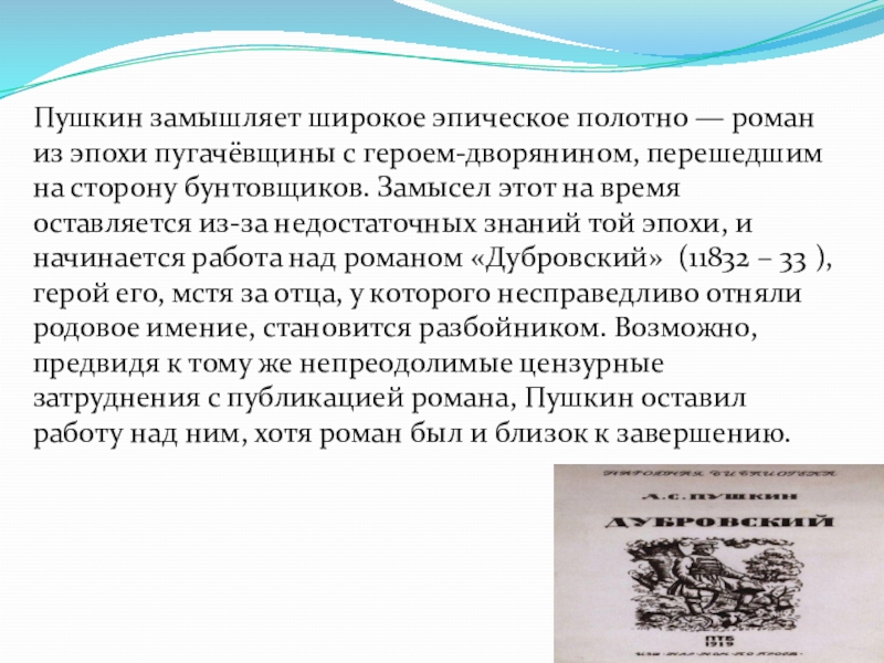 перешедшим на сторону бунтовщиков. Замысел этот на время оставляется из-за недостаточных знаний той эпохи, и начинается работа над романом «Дубровский» (11832 – 33 ), герой его, мстя за отца, у которого несправедливо отняли родовое имение, становится разбойником. Возможно, предвидя к тому же непреодолимые цензурные затруднения с публикацией романа, Пушкин оставил работу над ним, хотя роман был и близок к завершению.
