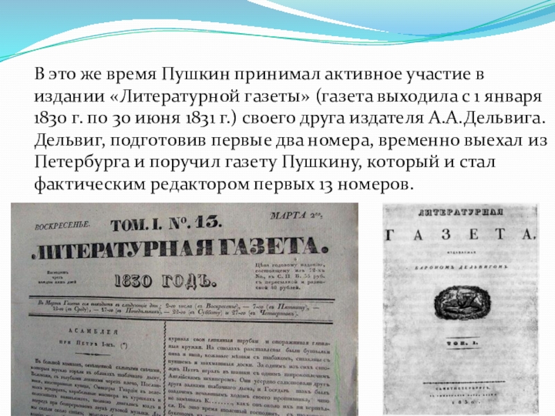 газеты» (газета выходила с 1 января 1830 г. по 30 июня 1831 г.) своего друга издателя А.А.Дельвига. Дельвиг, подготовив первые два номера, временно выехал из Петербурга и поручил газету Пушкину, который и стал фактическим редактором первых 13 номеров.