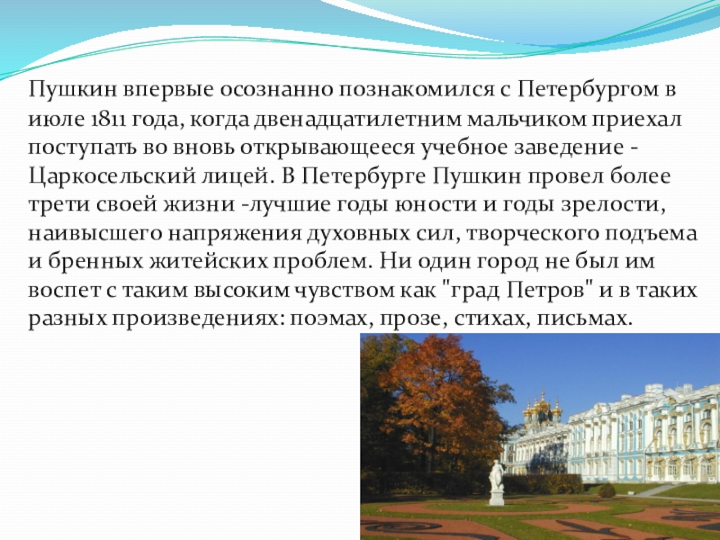 года, когда двенадцатилетним мальчиком приехал поступать во вновь открывающееся учебное заведение - Царкосельский лицей. В Петербурге Пушкин провел более трети своей жизни -лучшие годы юности и годы зрелости, наивысшего напряжения духовных сил, творческого подъема и бренных житейских проблем. Ни один город не был им воспет с таким высоким чувством как "град Петров" и в таких разных произведениях: поэмах, прозе, стихах, письмах.