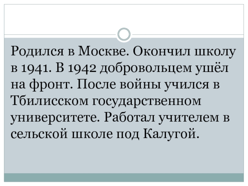 на фронт. После войны учился в Тбилисском государственном университете. Работал учителем в сельской школе под Калугой.