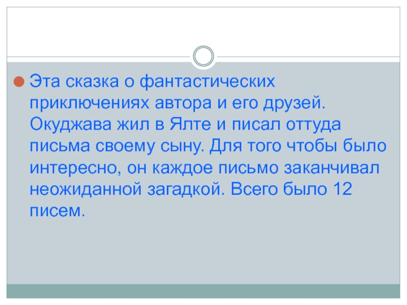 в Ялте и писал оттуда письма своему сыну. Для того чтобы было интересно, он каждое письмо заканчивал неожиданной загадкой. Всего было 12 писем.