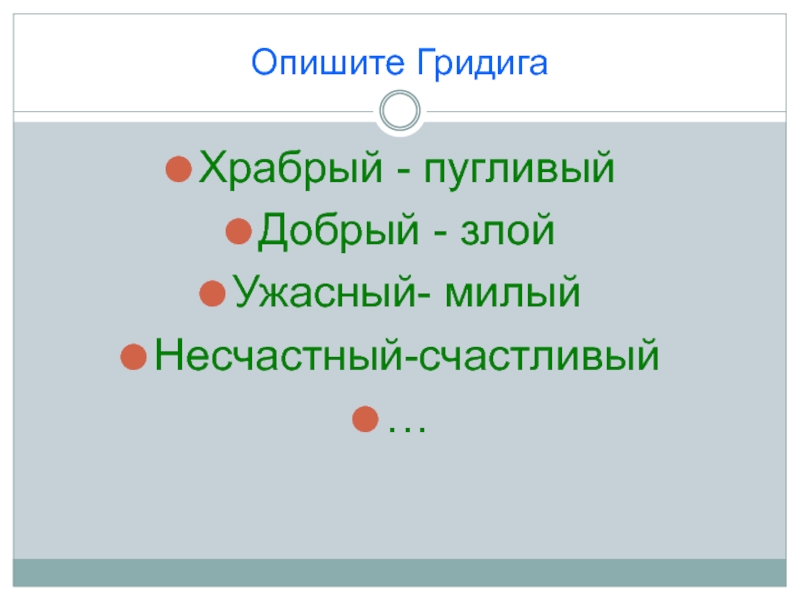 Опишите ГридигаХрабрый - пугливыйДобрый - злойУжасный- милыйНесчастный-счастливый…