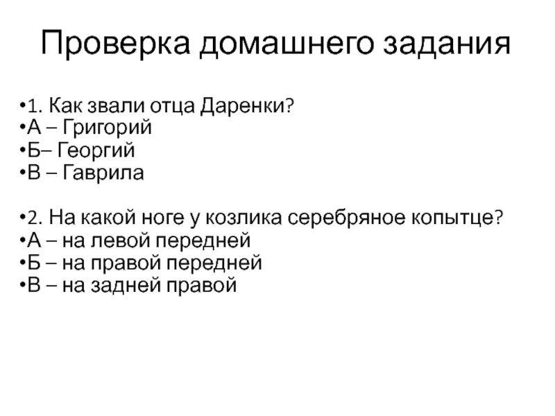 Проверка домашнего задания1. Как звали отца Даренки?А – ГригорийБ– ГеоргийВ – Гаврила2. На какой ноге у козлика