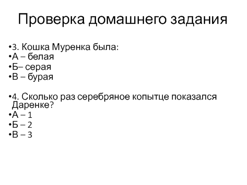 Проверка домашнего задания3. Кошка Муренка была:А – белаяБ– сераяВ – бурая4. Сколько раз серебряное копытце показался Даренке?А