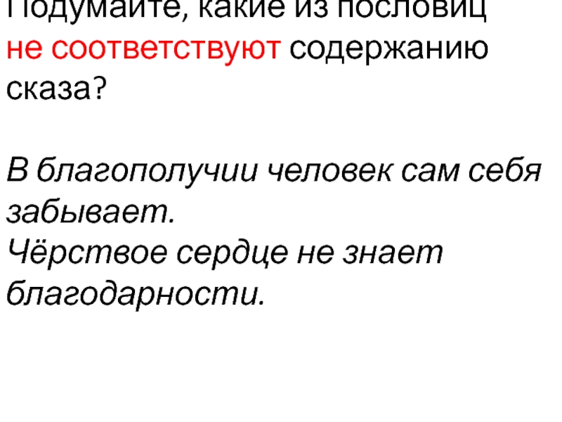 Подумайте, какие из пословиц не соответствуют содержанию сказа?В благополучии человек сам себя забывает.Чёрствое сердце не знает благодарности.