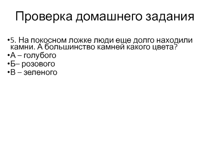 Проверка домашнего задания5. На покосном ложке люди еще долго находили камни. А большинство камней какого цвета?А –