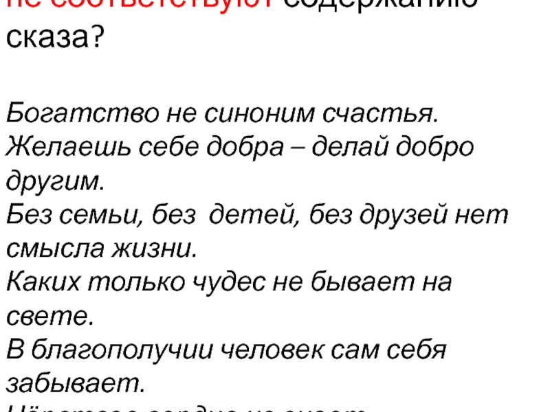 Подумайте, какие из пословиц не соответствуют содержанию сказа?Богатство не синоним счастья.Желаешь себе добра – делай добро другим.Без