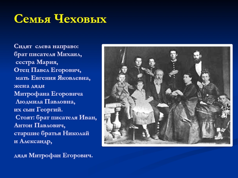 Павел Егорович, мать Евгения Яковлевна, жена дяди Митрофана Егоровича Людмила Павловна, их сын Георгий. Стоят: брат писателя Иван, Антон Павлович, старшие братья Николай и Александр, дядя Митрофан Егорович.