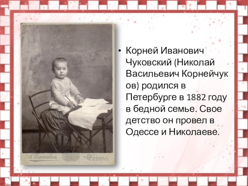 фамилия, а придуманные. Писатель создал себе псевдоним из собственной фамилии. А настоящие имя и фамилия ̶ Никола́й Васильевич Корнейчуко́в.