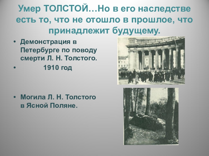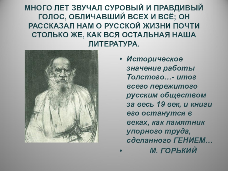 Историческое значение работы Толстого…- итог всего пережитого русским обществом за весь 19 век, и книги его останутся в веках, как памятник упорного труда, сделанного ГЕНИЕМ…