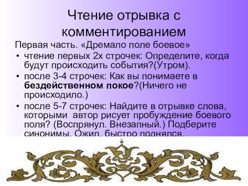 после 5-7 строчек: Найдите в отрывке слова, которыми автор рисует пробуждение боевого поля? (Воспрянул. Внезапный.) Подберите синонимы. Ожил, быстро поднялся. Неожиданный.