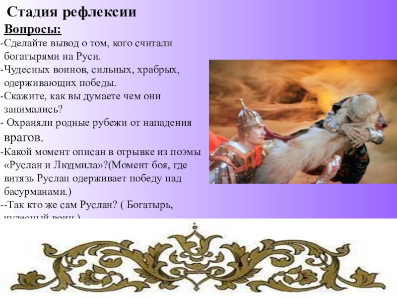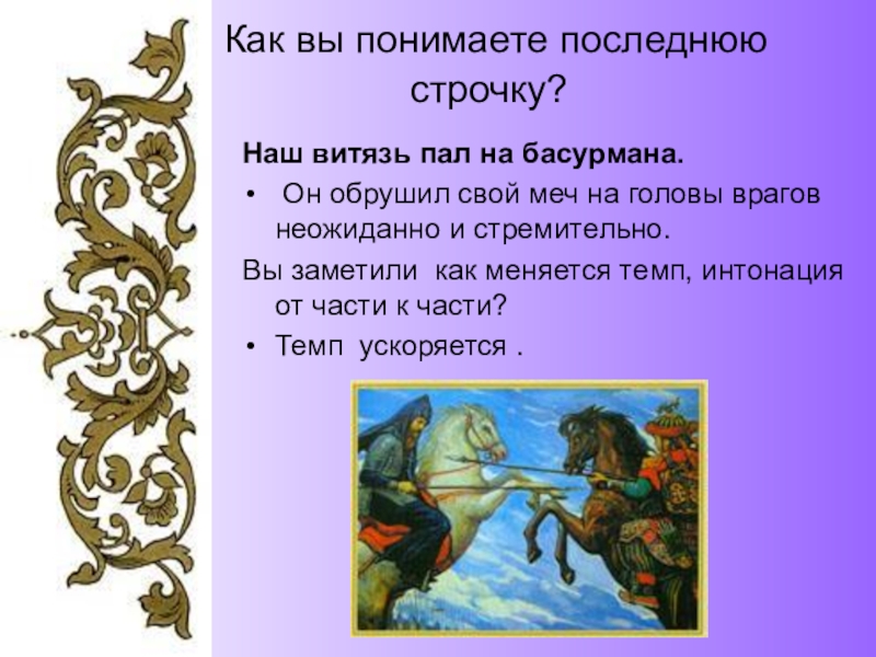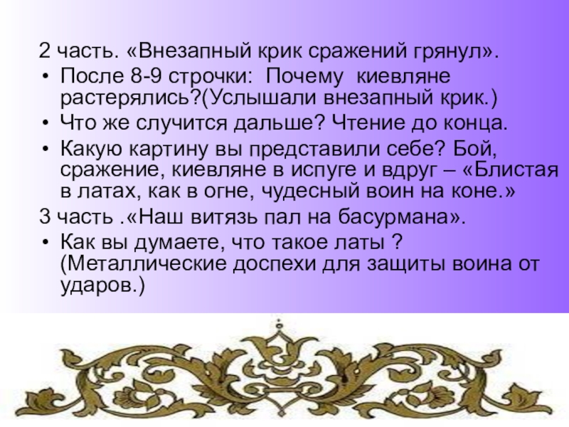 Какую картину вы представили себе? Бой, сражение, киевляне в испуге и вдруг – «Блистая в латах, как в огне, чудесный воин на коне.»