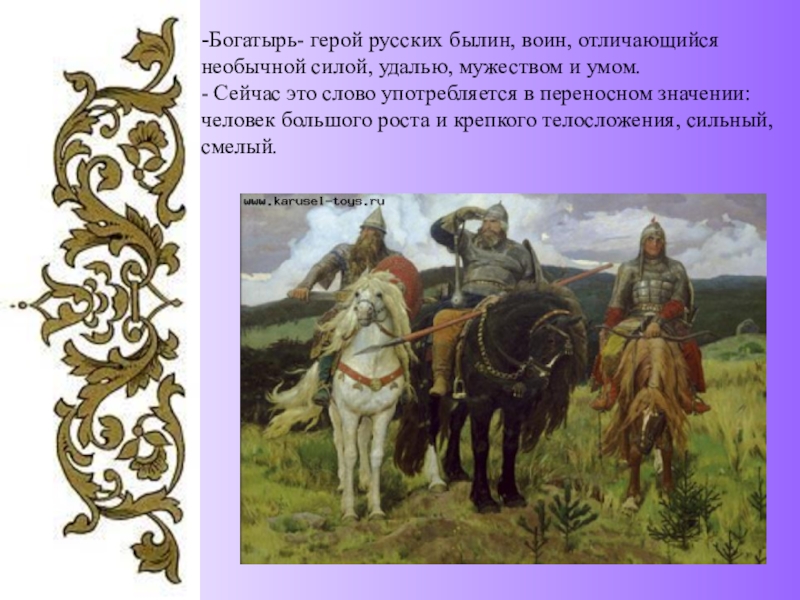 Слайд 7-Богатырь- герой русских былин, воин, отличающийся необычной силой, удалью, мужеством и