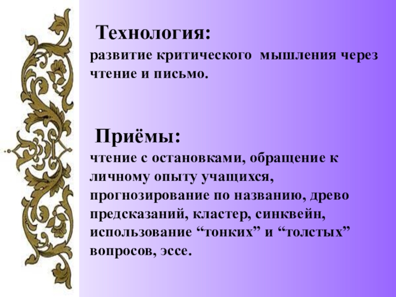 с остановками, обращение к личному опыту учащихся, прогнозирование по названию, древо предсказаний, кластер, синквейн, использование “тонких” и “толстых” вопросов, эссе.
