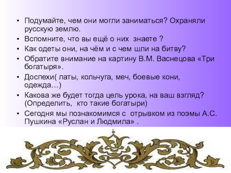 Какова же будет тогда цель урока, на ваш взгляд? (Определить, кто такие богатыри)