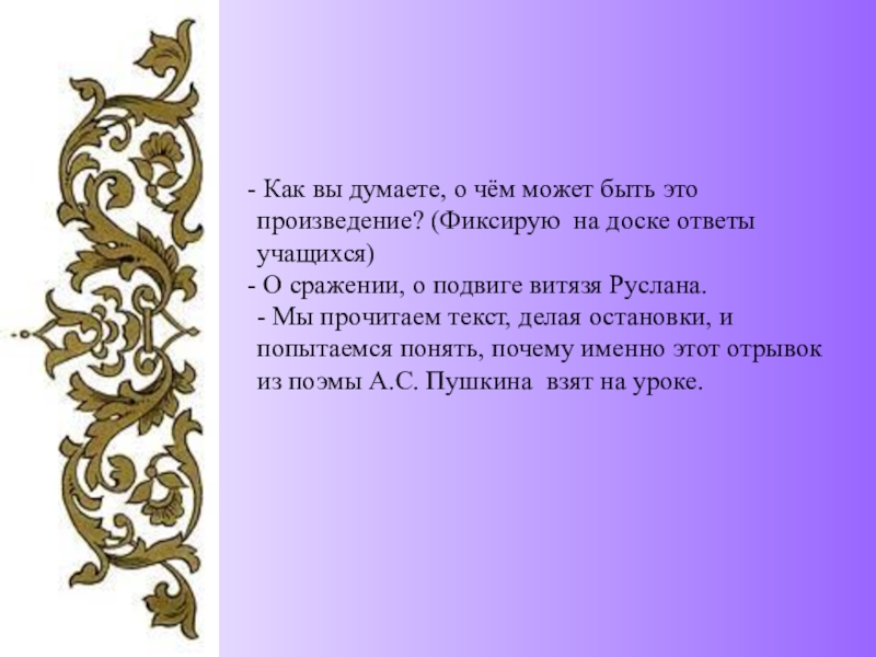 - Мы прочитаем текст, делая остановки, и попытаемся понять, почему именно этот отрывок из поэмы А.С. Пушкина взят на уроке.