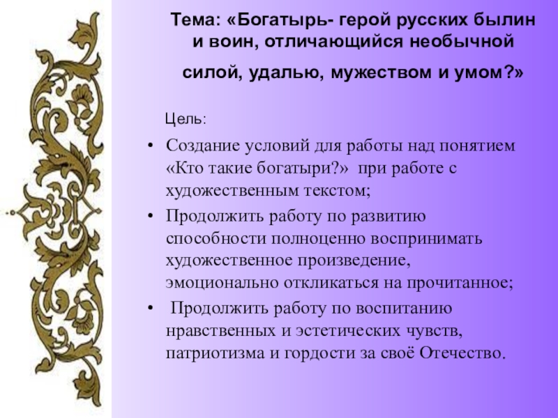 Слайд 2Тема: «Богатырь- герой русских былин