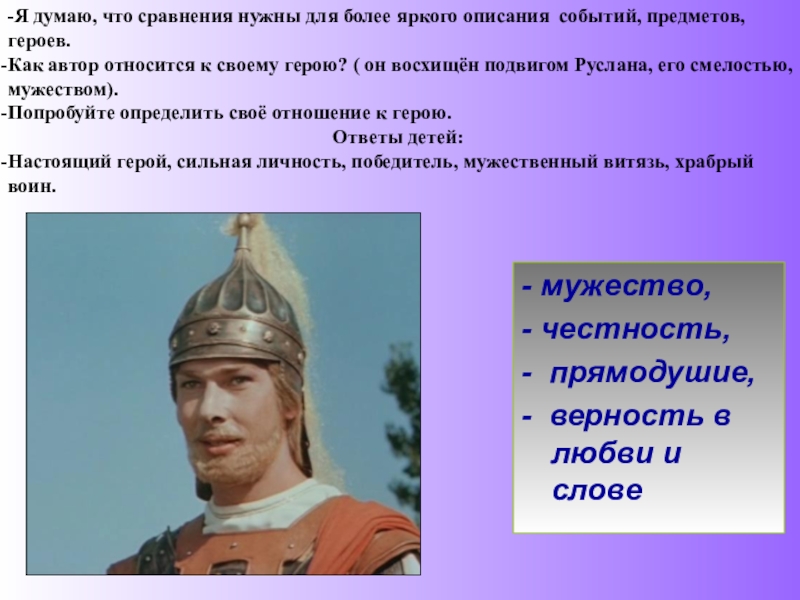 Как автор относится к своему герою? ( он восхищён подвигом Руслана, его смелостью, мужеством).