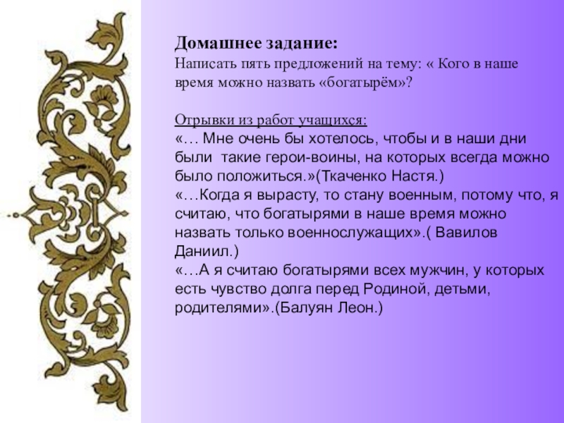 «…А я считаю богатырями всех мужчин, у которых есть чувство долга перед Родиной, детьми, родителями».(Балуян Леон.)