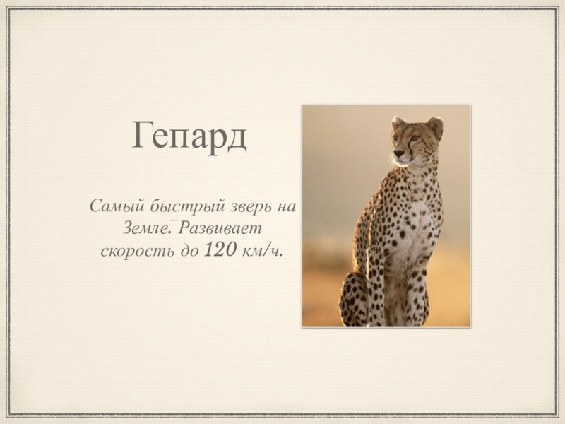 Самый быстрый зверь на Земле. Развивает скорость до 120 км/ч.