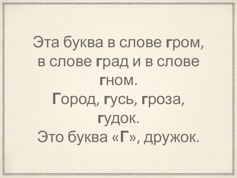 Эта буква в слове гром, в слове град и в слове гном. Город, гусь, гроза, гудок. Это