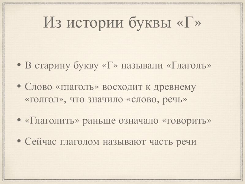Из истории буквы «Г»В старину букву «Г» называли «Глаголъ»Слово «глаголъ» восходит к древнему «голгол», что значило «слово,