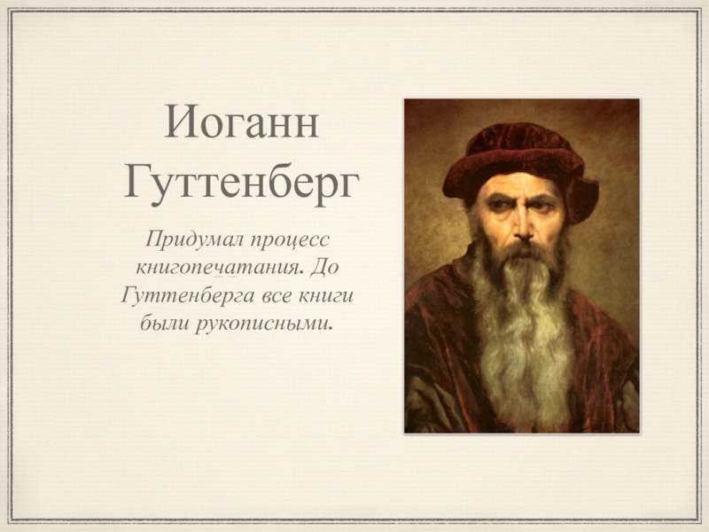 Иоганн ГуттенбергПридумал процесс книгопечатания. До Гуттенберга все книги были рукописными.