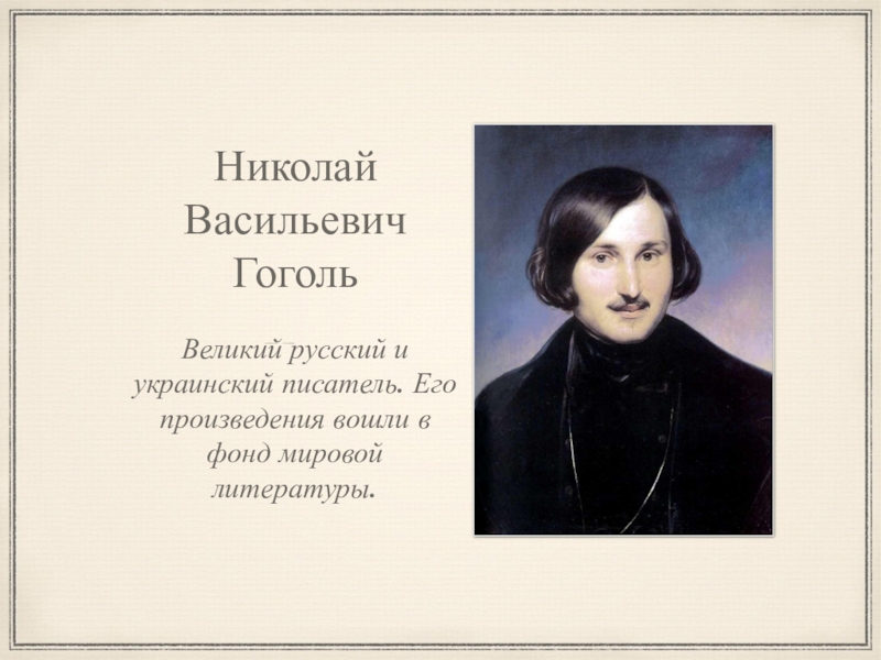 Николай Васильевич ГогольВеликий русский и украинский писатель. Его произведения вошли в фонд мировой литературы.