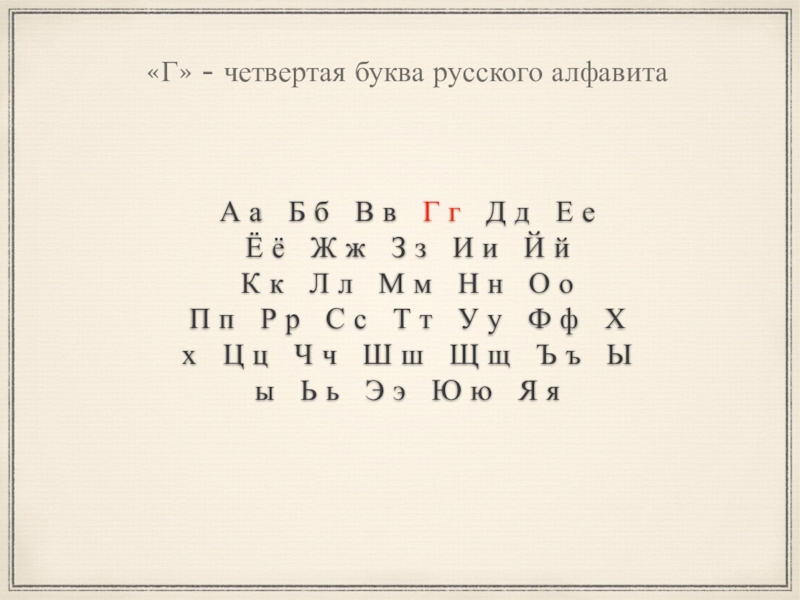 «Г» - четвертая буква русского алфавитаА а  Б б  В в  Г г