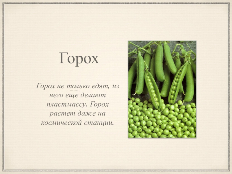 ГорохГорох не только едят, из него еще делают пластмассу. Горох растет даже на космической станции.