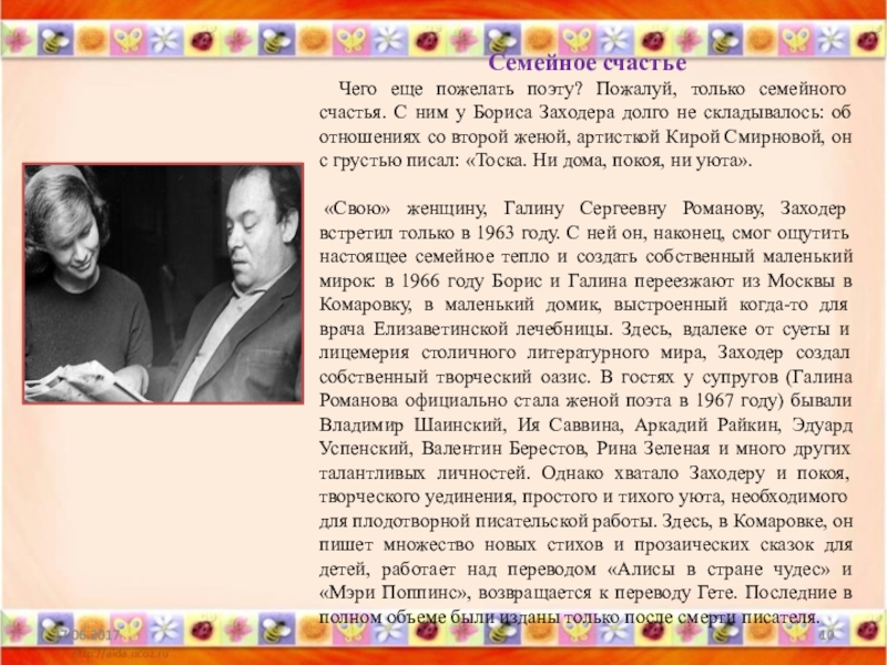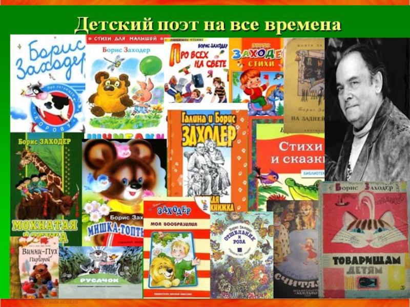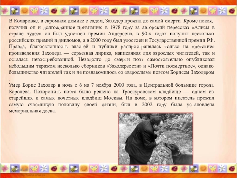самой смерти. Кроме покоя, получил он и долгожданное признание: в 1978 году за авторский перессказ «Алисы в стране чудес» он был удостоен премии Андерсена, в 90-х годах получил несколько российских премий и дипломов, а в 2000 году был удостоен и Государственной премии РФ. Правда, благосклонность властей и публики распространялась только на «детские» произведения Заходера — серьезная лирика, написанная для взрослых читателей, так и осталась невостребованной. Незадолго до смерти поэт самостоятельно опубликовал небольшим тиражом несколько сборников «Заходерзости» и «Почти посмертное», однако большинство читателей так и не познакомилось со «взрослым» поэтом Борисом Заходером .