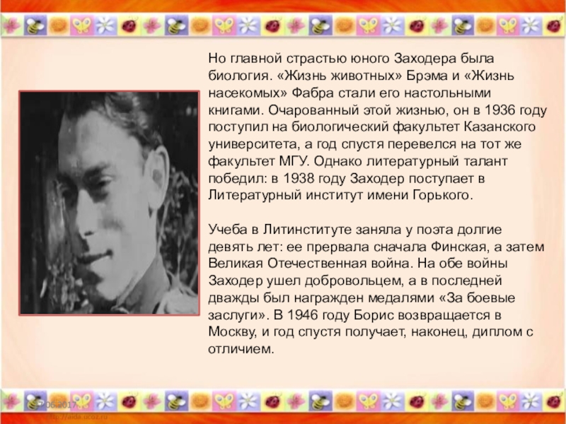 «Жизнь насекомых» Фабра стали его настольными книгами. Очарованный этой жизнью, он в 1936 году поступил на биологический факультет Казанского университета, а год спустя перевелся на тот же факультет МГУ. Однако литературный талант победил: в 1938 году Заходер поступает в Литературный институт имени Горького.