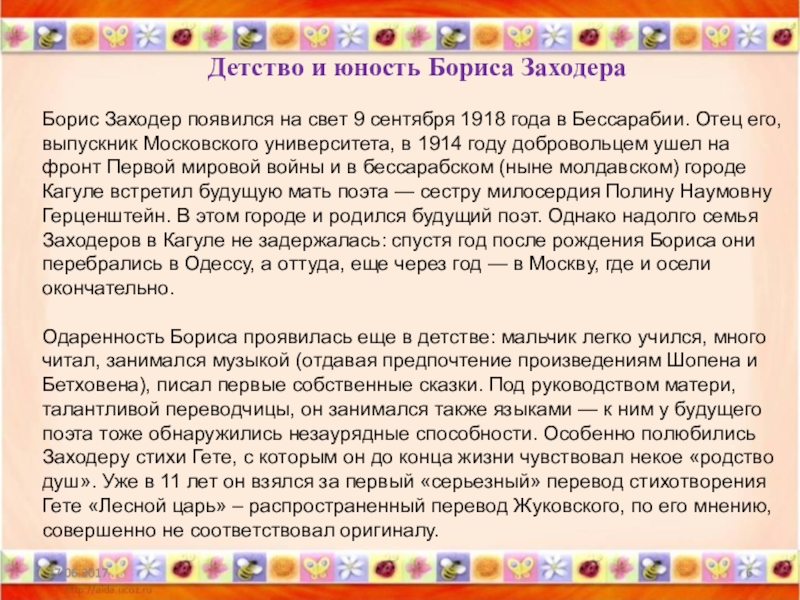 1918 года в Бессарабии. Отец его, выпускник Московского университета, в 1914 году добровольцем ушел на фронт Первой мировой войны и в бессарабском (ныне молдавском) городе Кагуле встретил будущую мать поэта — сестру милосердия Полину Наумовну Герценштейн. В этом городе и родился будущий поэт. Однако надолго семья Заходеров в Кагуле не задержалась: спустя год после рождения Бориса они перебрались в Одессу, а оттуда, еще через год — в Москву, где и осели окончательно.