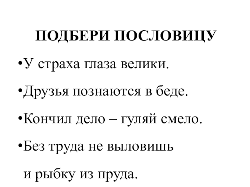 ПОДБЕРИ ПОСЛОВИЦУУ страха глаза велики.Друзья познаются в беде.Кончил дело – гуляй смело.Без труда не выловишь и рыбку