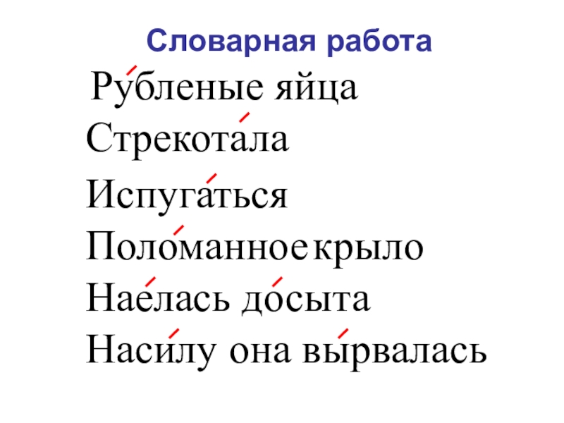 Словарная работаНасилу она вырваласьРубленые яйцаСтрекоталаИспугатьсяПоломанное крылоНаелась досыта