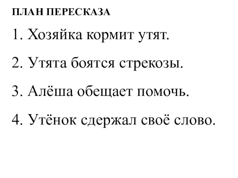ПЛАН ПЕРЕСКАЗА1. Хозяйка кормит утят.2. Утята боятся стрекозы.3. Алёша обещает помочь.4. Утёнок сдержал своё слово.