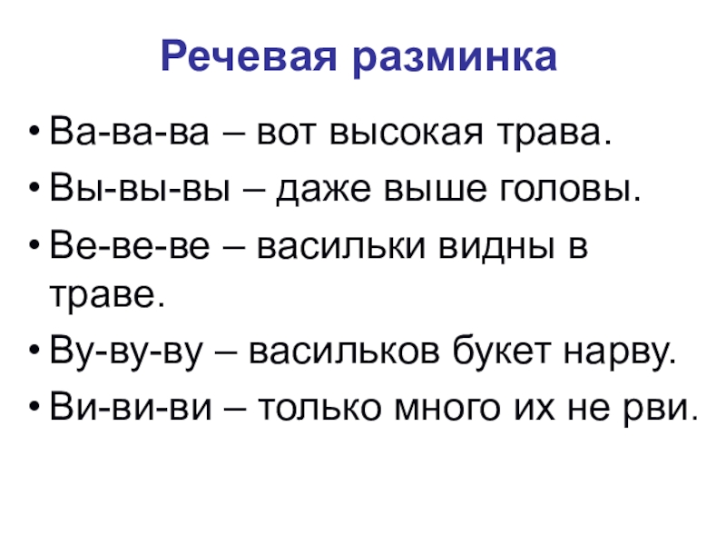 Речевая разминкаВа-ва-ва – вот высокая трава.Вы-вы-вы – даже выше головы.Ве-ве-ве – васильки видны в траве.Ву-ву-ву – васильков букет нарву.Ви-ви-ви – только много их не рви.