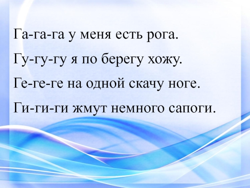 Га-га-га у меня есть рога.Гу-гу-гу я по берегу хожу.Ге-ге-ге на одной скачу ноге.Ги-ги-ги жмут немного сапоги.