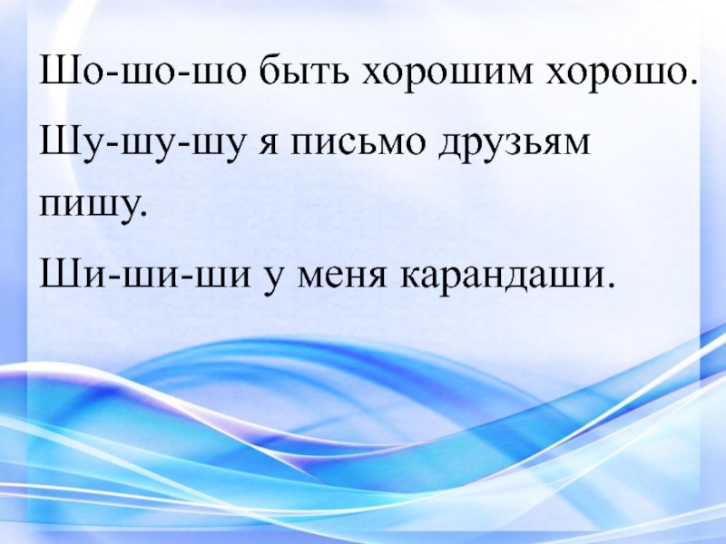 Шо-шо-шо быть хорошим хорошо.Шу-шу-шу я письмо друзьям пишу.Ши-ши-ши у меня карандаши.