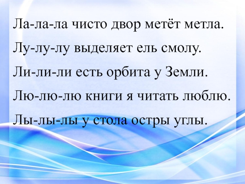 Ла-ла-ла чисто двор метёт метла.Лу-лу-лу выделяет ель смолу.Ли-ли-ли есть орбита у Земли.Лю-лю-лю книги я читать люблю.Лы-лы-лы у