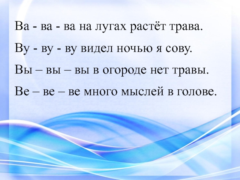 Ва - ва - ва на лугах растёт трава.Ву - ву - ву видел ночью я сову.Вы – вы – вы в огороде нет травы.Ве – ве – ве много мыслей в голове.