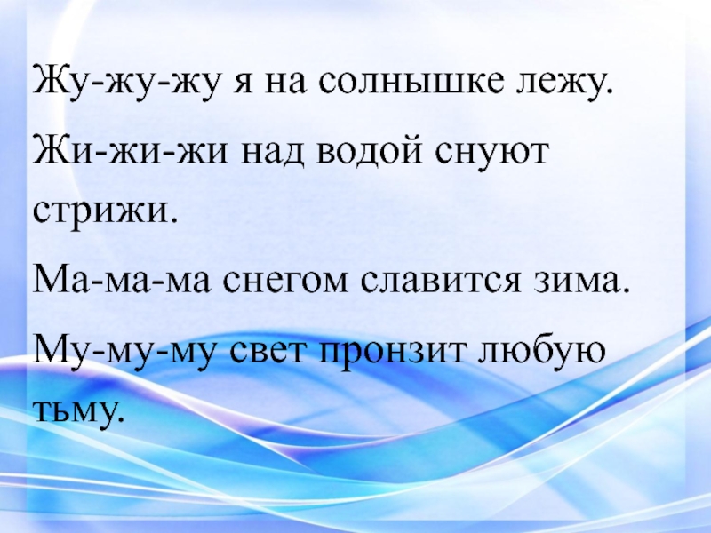 Жу-жу-жу я на солнышке лежу.Жи-жи-жи над водой снуют стрижи.Ма-ма-ма снегом славится зима.Му-му-му свет пронзит любую тьму.