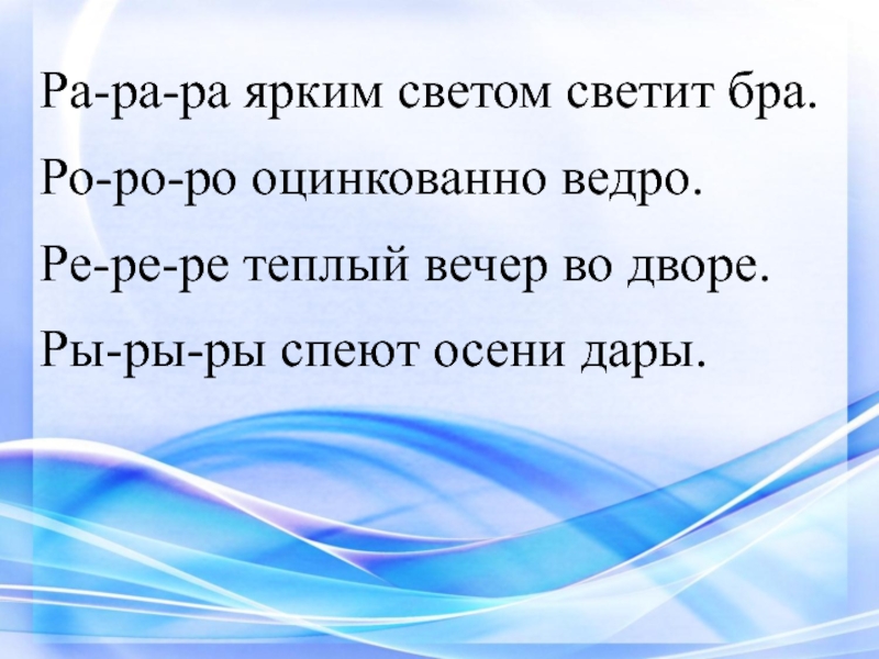 Ра-ра-ра ярким светом светит бра.Ро-ро-ро оцинкованно ведро.Ре-ре-ре теплый вечер во дворе.Ры-ры-ры спеют осени дары.